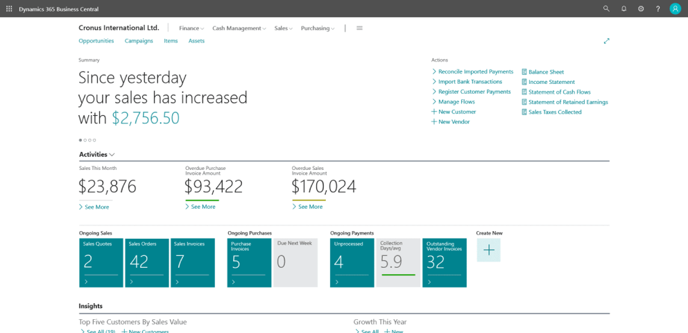 A nivel de funcionalidades, al igual que Navision o Dynamics NAV, continúa ofreciendo un control de todas las áreas principales de la empresa (finanzas, contabilidad, ventas, CRM, producción, almacenes, compras, etc.), pero optimizadas para facilitar tanto la entrada del dato a los usuarios como la navegación por el ERP.