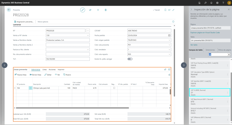 En Ekadis 2024 wave 1 hemos incluido en las líneas de preventa el % de IVA, así como el Importe de IVA y el Importe de IVA incluido.