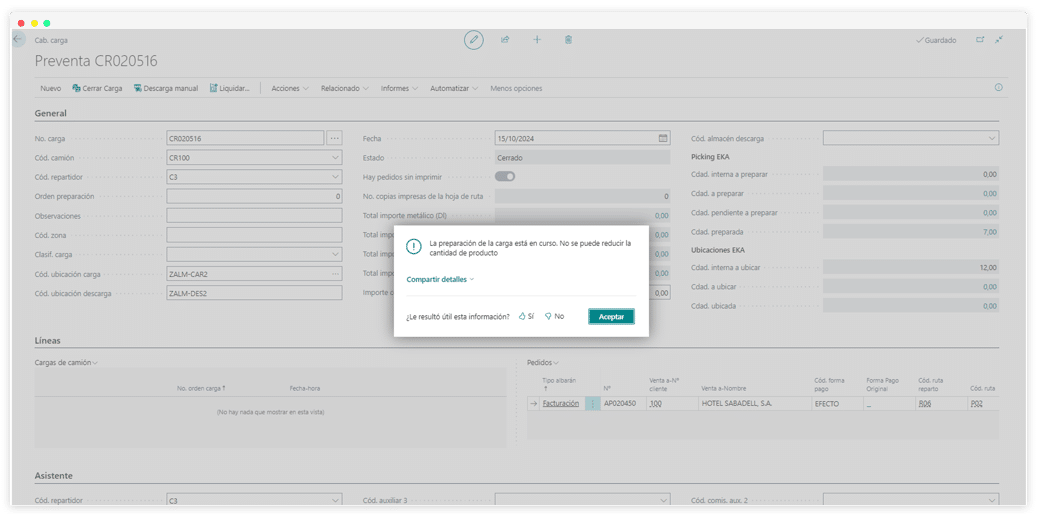 - Cargas cerradas pero no entregadas: será posible añadir cantidad en un pedido, abriendo de nuevo la carga (tal y como indicará el sistema)