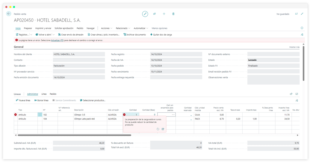 Si no hay stock suficiente de algún producto en la ubicación de descarga, el sistema emitirá un error, indicando que será necesario liquidar la carga con los movimientos generados y, posteriormente, realizar los ajustes necesarios.