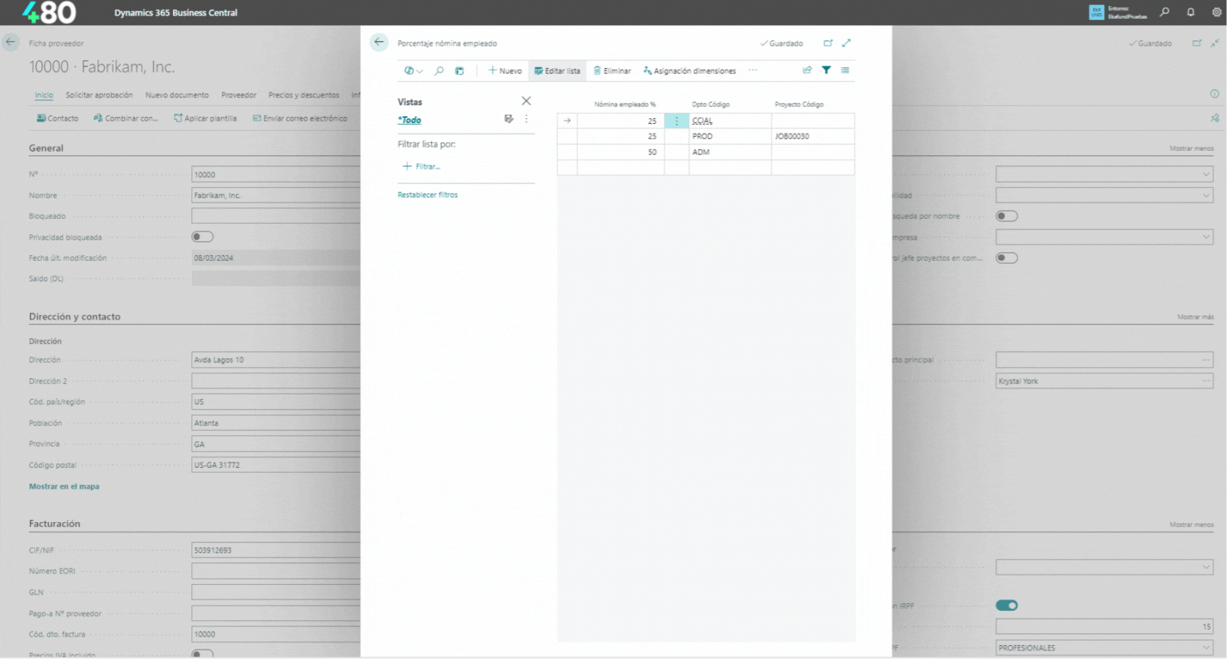 Desde la ficha de cada empleado (registrado como proveedor), es posible acceder a una pantalla donde se configuran los porcentajes y las dimensiones de destino para la imputación de cada asiento de nómina. Esta configuración genera automáticamente líneas de diario general, distribuyendo los asientos de nómina según los porcentajes y dimensiones establecidos para cada empleado.