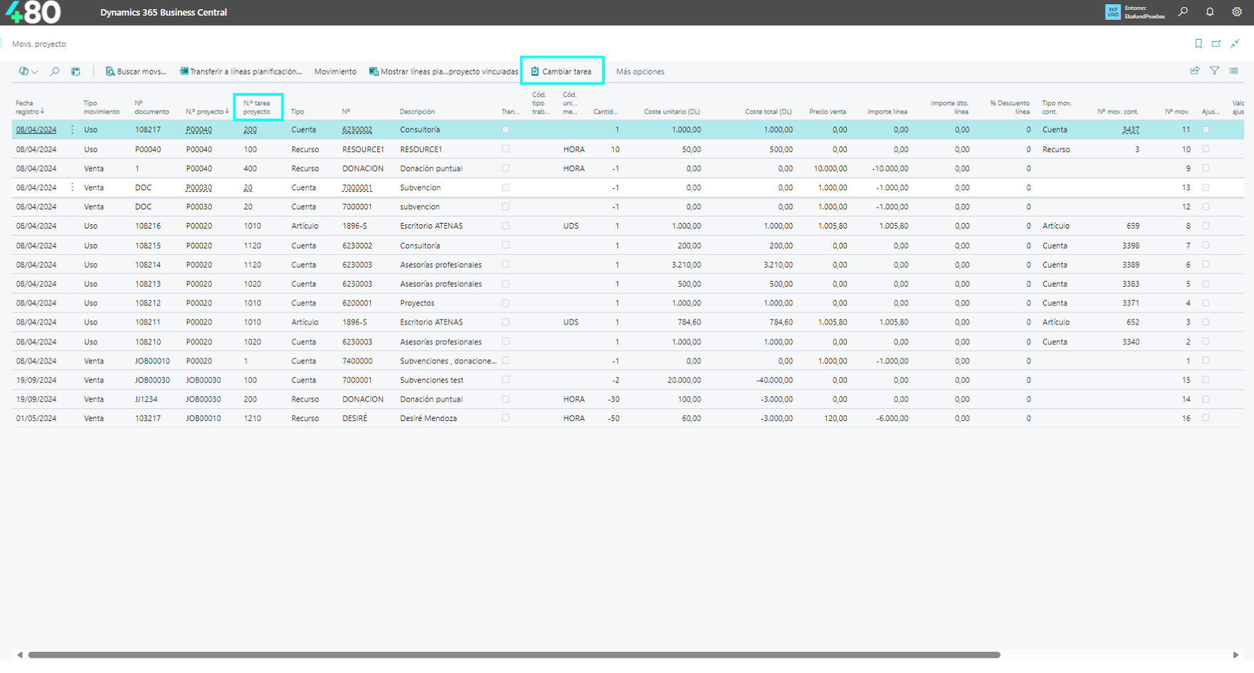 Ahora, al acceder a los movimientos de proyecto, se incluye la opción “Cambiar de tarea”, accesible desde la columna “Real (coste total)”. Al seleccionar esta acción, el sistema genera automáticamente un diario de proyectos con dos movimientos: uno que revierte el movimiento seleccionado y otro idéntico al seleccionado, pero asignado a la nueva tarea.