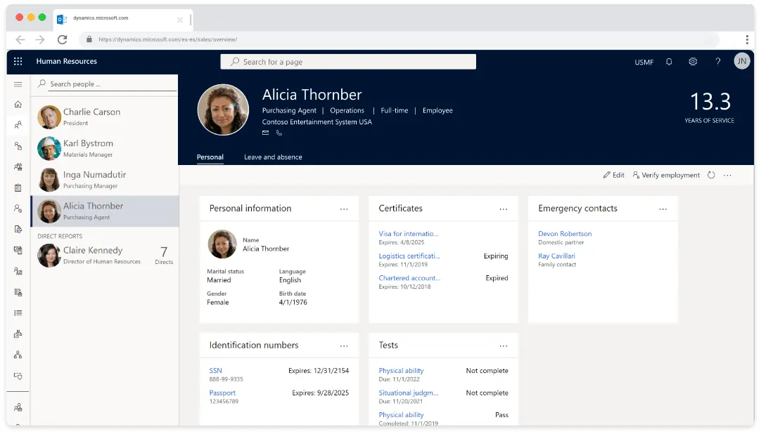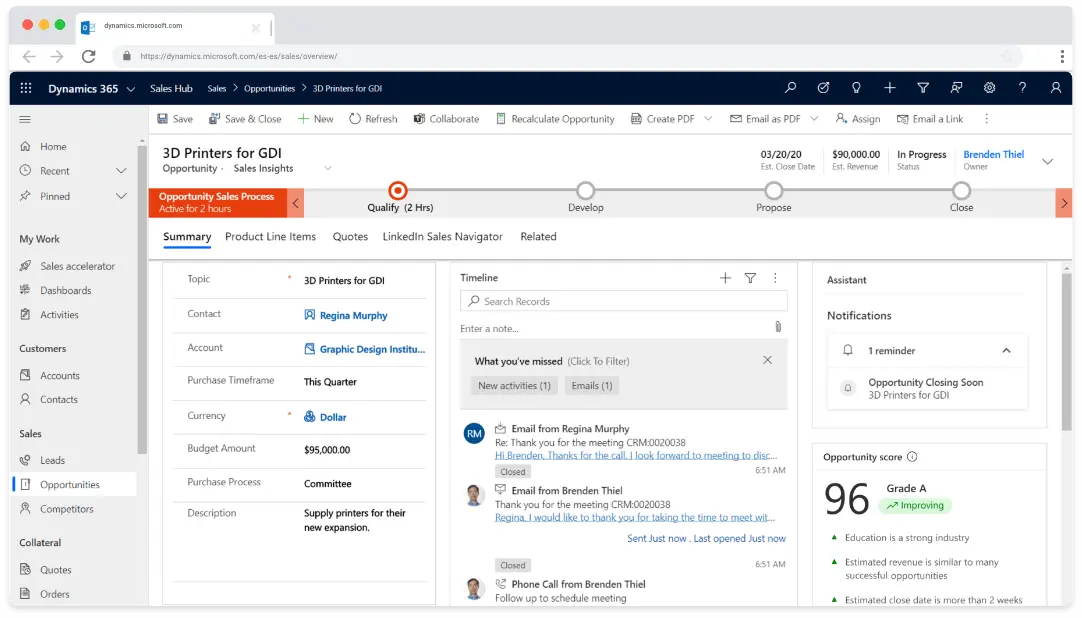 Dynamics 365 for Sales es un sistema completo de gestión de relaciones con los clientes. Además de la gestión estándar de oportunidades y leads, puedes administrar fácilmente tus contactos, cuentas y oportunidades.