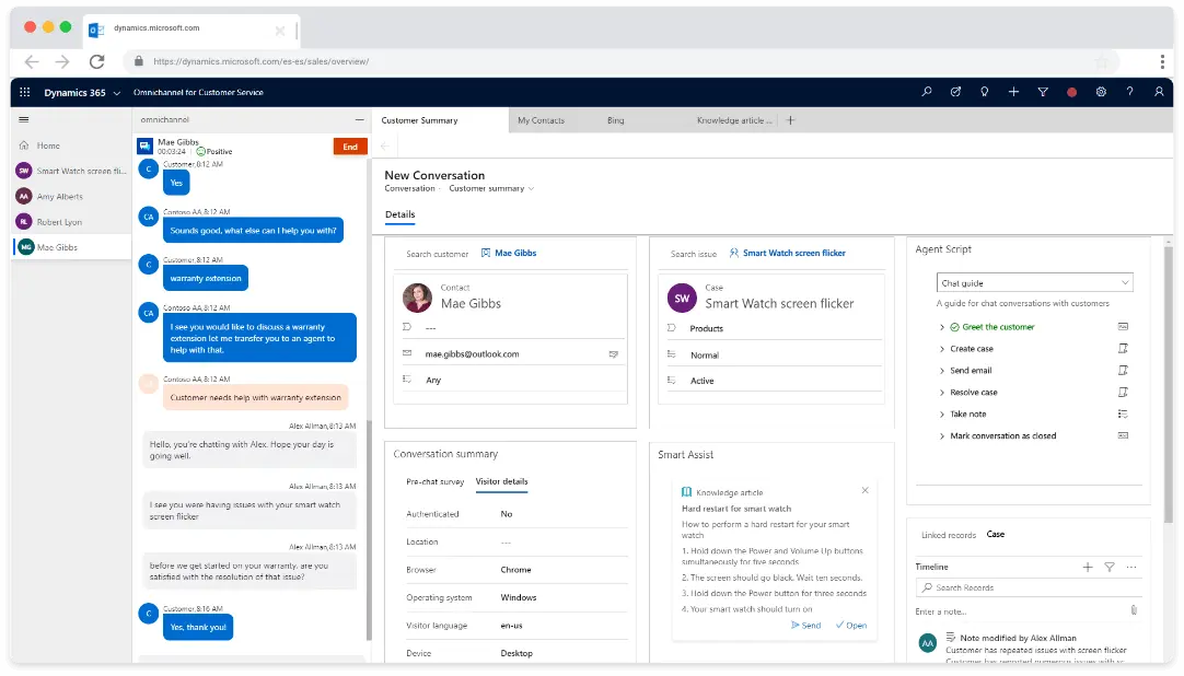 Microsoft Dynamics 365 for Customer Service agrupa administración de casos, administración de conocimiento, comunidades / foros o redes sociales de servicio al cliente.